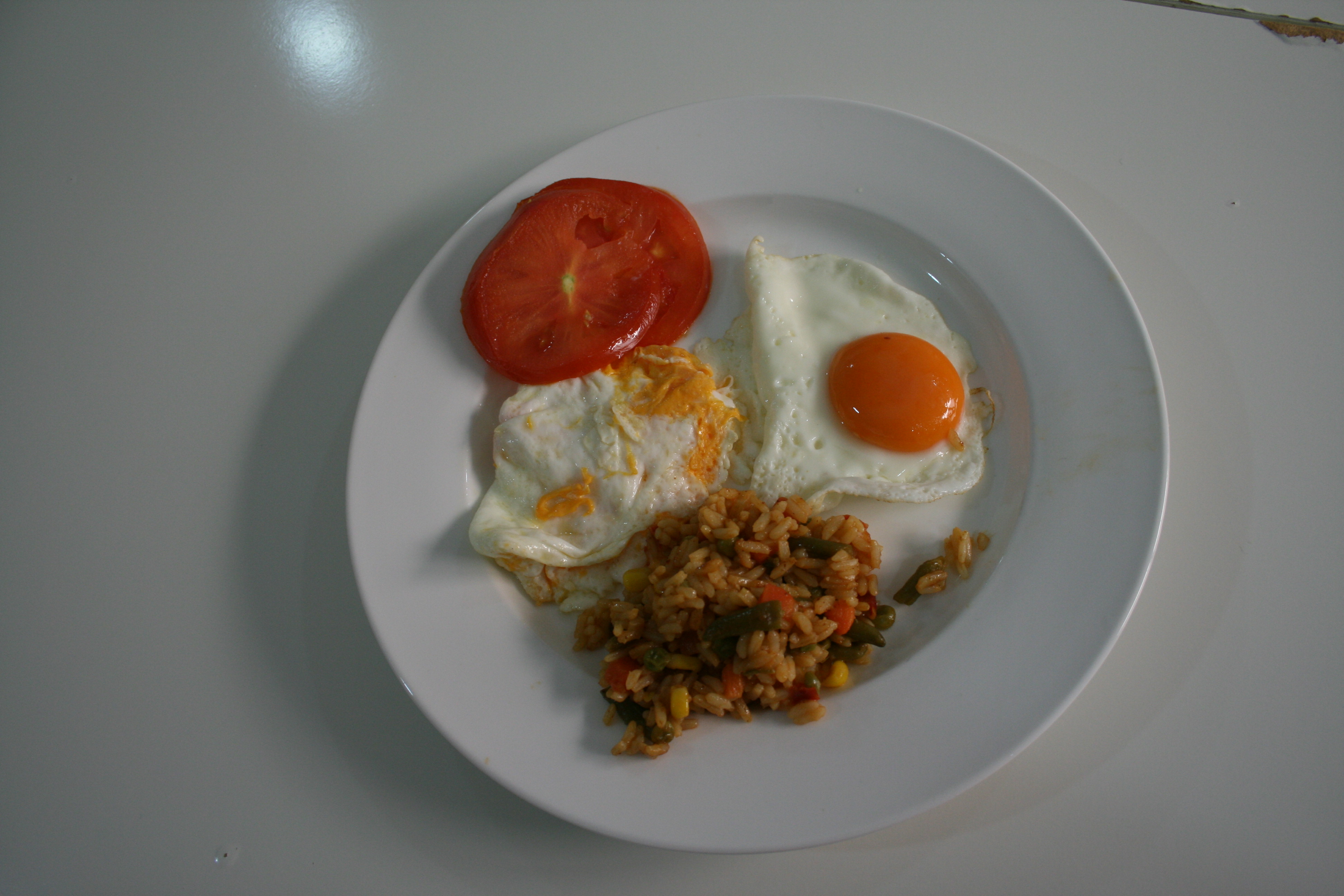 This week, on Thursday I woke up STARVING after having a quite vivid dream about PIZZA, I’m obsessed with Pizza so having a dream about it can cause me to get up early in search of something to fill my tummy up fast. I didn’t have pizza so instead I opted for fried eggs, fried rice and some fan fried tomato. I usually don’t go for big breakfast fry ups when i’m at home, so this was quite the change.