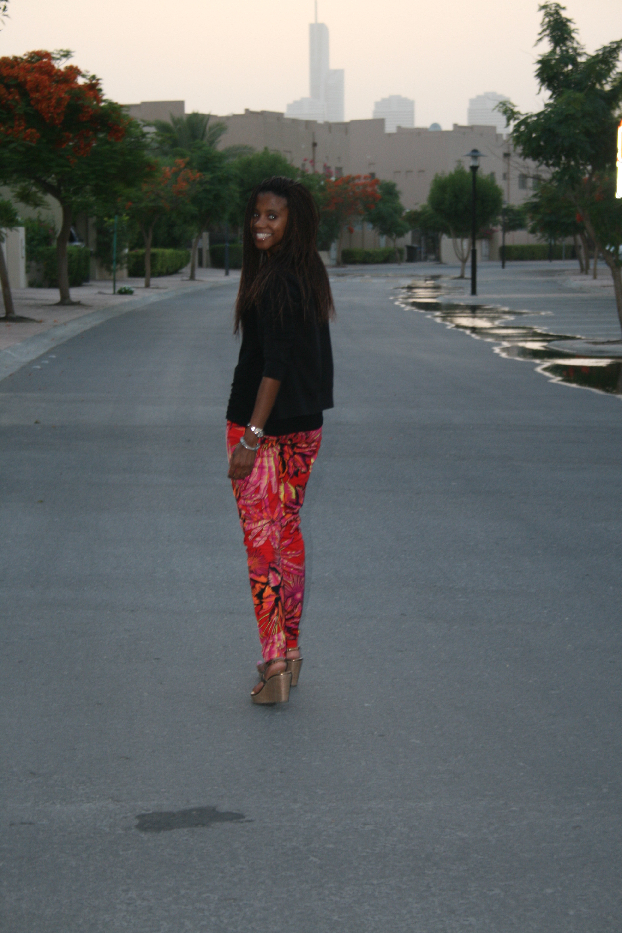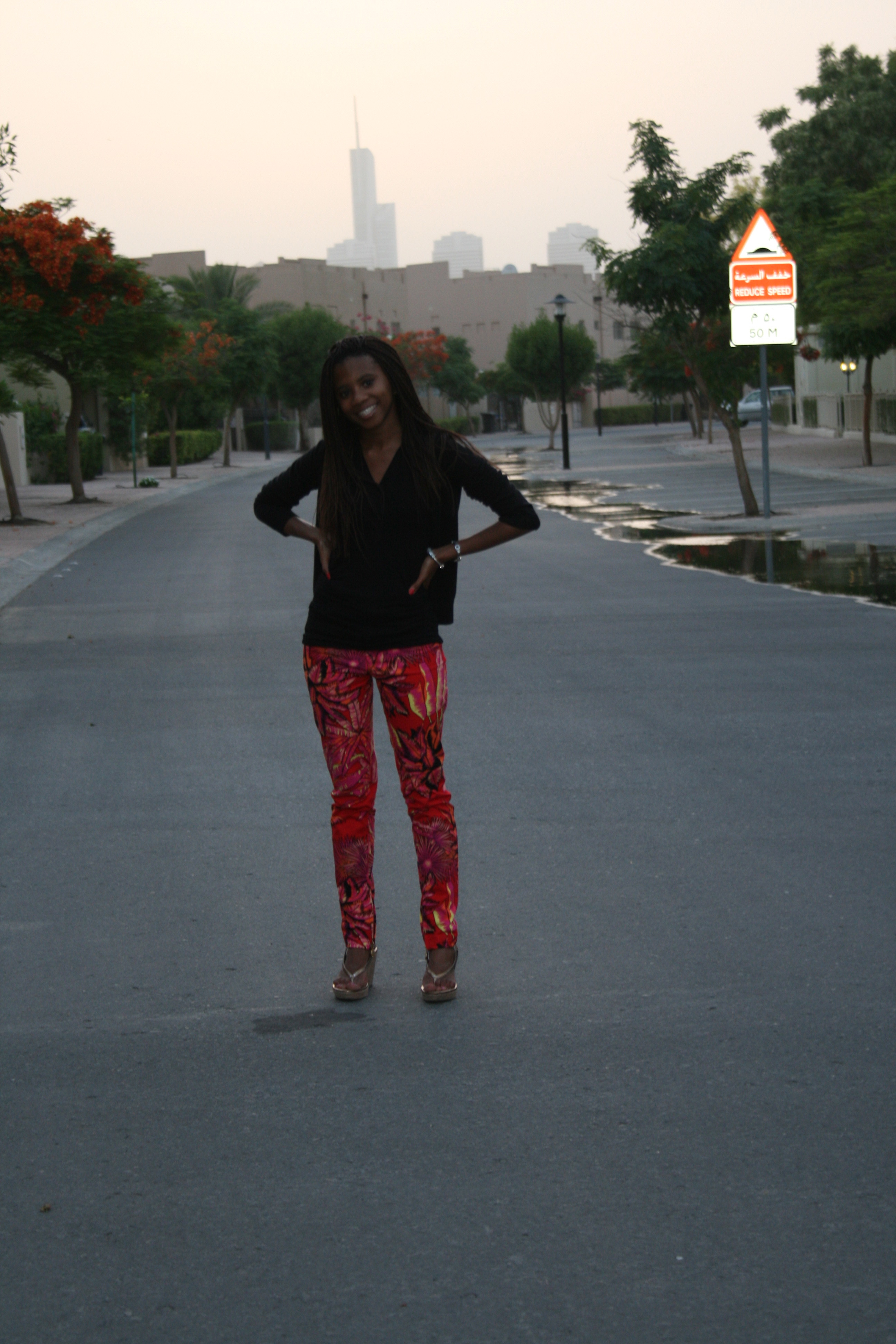 Onto my 20th Birthday, I had just finished my first year of university and I had soared into my 20s. I bought these Versace for H&M Jeans a few months before my birthday on the day of the launch here in Dubai. And I had been so excited about it for months, so I decided to leave university at around lunch time and head to the mall. Now let’s please note that I barely ever went to the mall on a school night to go shopping never mind a school day, so this was a rare occasion indeed. I remember being in such a rush and buying the jeans super quickly. there was barely anything left in the store as the fashionista’s were there since the morning. But this was my one and only chance to buy them and i picked them up and rushed back to school for a meeting. It was so rushed in fact that I lost my cardigan whilst running. But I think I lost my cardigan often because it seems like I’m sporting another black cardigan in this photo. I love the lighting in this photo and the fact thatI’m standing in the middle of the road with no one in sight. I also like the fact that the flowers in the trees match my trousers.